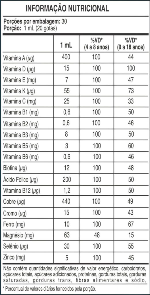 Apenas 1ml por dia em gotas, com excelente aceitação infantil.